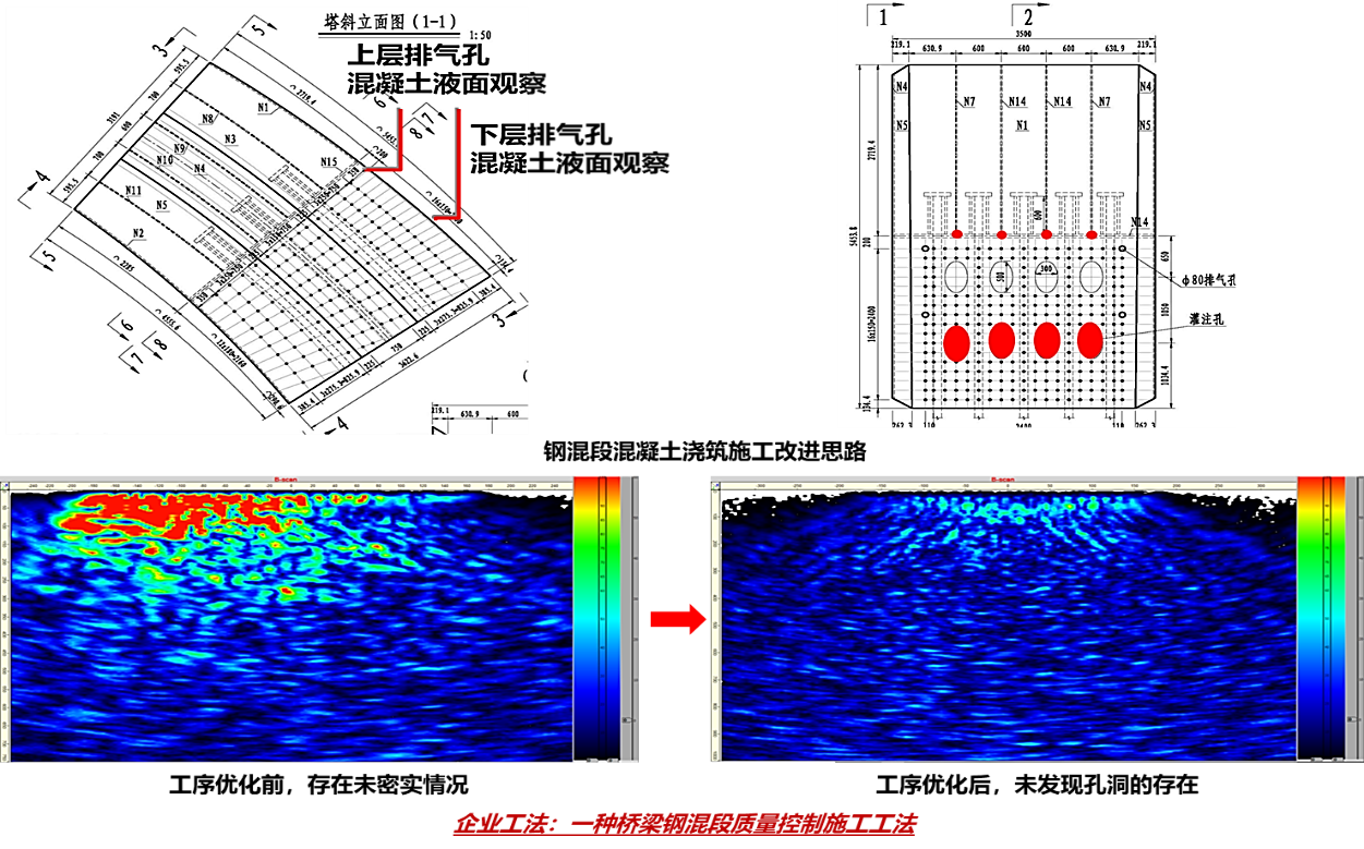 课题组针对桥梁钢混结合段施工质量难以控制的问题,开展超声阵列检测钢筋混凝土、钢砼组合结构的适用性研究,揭示了混凝土表面粗糙程度、表层钢筋以及超声波频率等因素对监测质量的影响,并采用超声反射阵列和超声透射组合的方法,对“花山大桥”钢混结合段施工进行实施监测与工序优化,提高了钢混结合段混凝土浇筑质量。