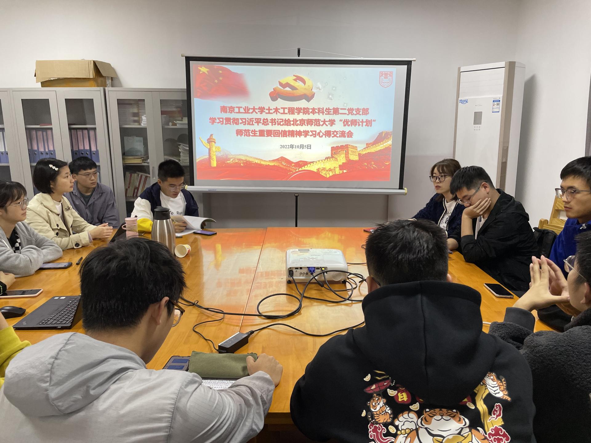 为深入学习领会习近平总书记给北京师范大学“优师计划”师范生的重要回信精神,增强党员政治理论修养,土木学院本科生第二党支部于10月5日晚召开学习交流会。支部全体党员参加会议,会议由党支部书记黄乐老师主持。