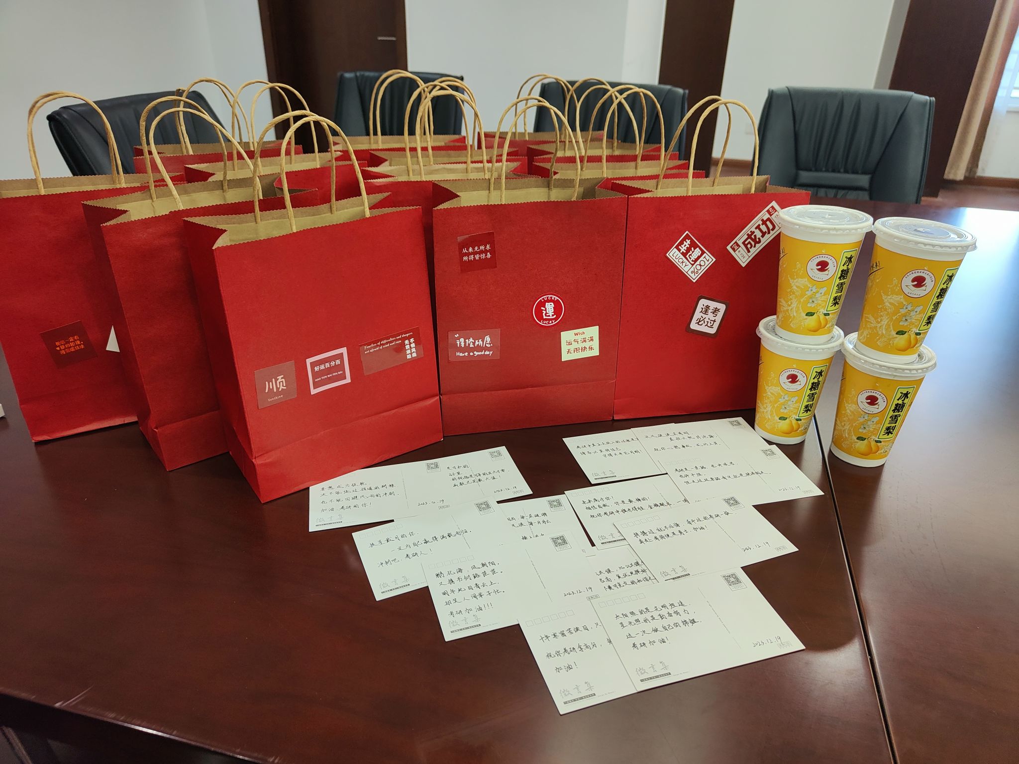 本二支部为每位考研党员准备了一份“定制版”暖心礼包。礼包内包含支部内2021级学弟学妹们亲笔写下的祝福寄语、柿试如意小香包、好试成双甜蜜橙、旺气冲天牛奶、心想试成薯愿包以及一杯温暖心脾的烤梨汁。座谈会上,大家畅所欲言,相互鼓励,彼此祝福。支部书记黄乐老师从统筹复习、劳逸结合、心态调整三个方面为同学们提供了宝贵的建议,鼓励大家合理规划时间和进度,做到劳逸结合,保持平稳的心态,以饱满的精神状态迎接最后的挑战,全力以赴地完成考研战场最后“一公里”。
