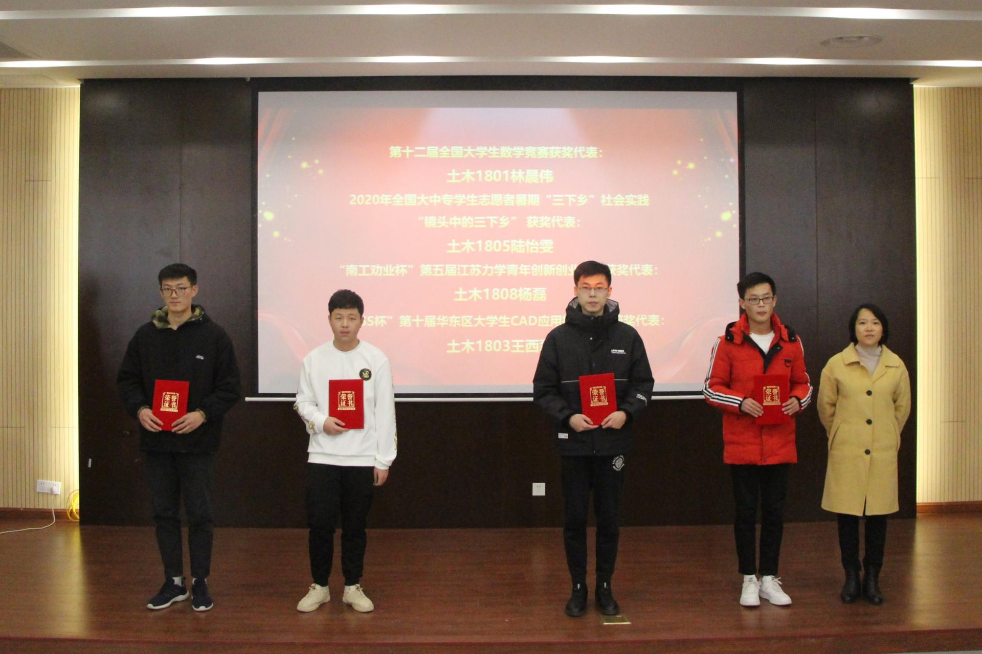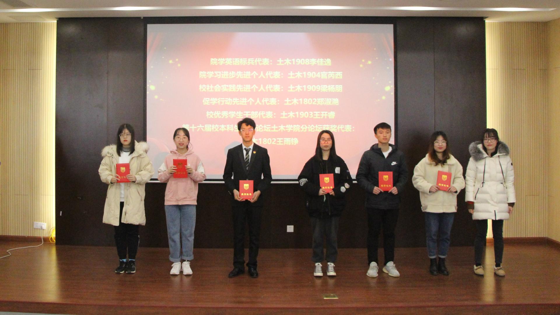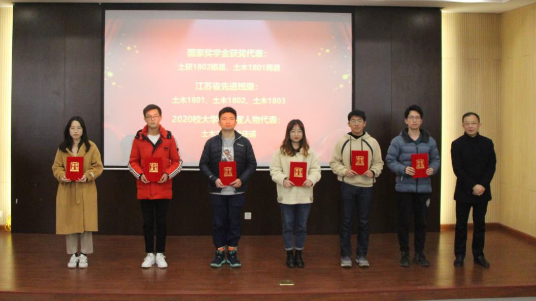 会议在土木类2015班全体同学演唱的《国家》 中拉开序幕,副院长王俊宣读了《tyc1286太阳成集团关于表彰先进集体和先进个人的决定》。随后,学院领导为获得 “国家奖学金”、“江苏省先进班级”、“校大学生年度人物”“校社会实践先进个人”“促学行动先进个人”等获奖学生代表颁发了荣誉证书。