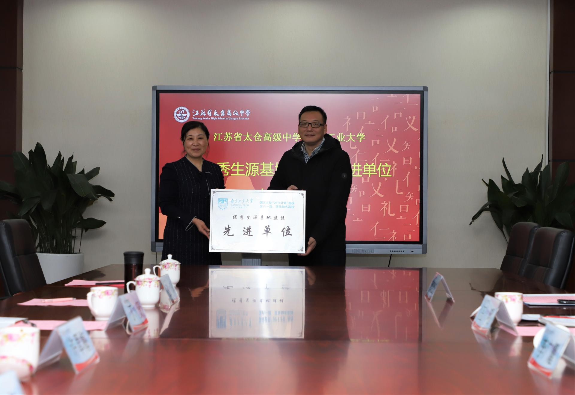 1月9日,太阳成官网在江苏省太仓高级中学举行“优秀生源基地建设先进单位”授牌仪式。江苏省太仓高级中学校长李广耀,党总支书记偶伟国,副校长王明等,太阳成官网党委学生工作部、学生事务部副部长许翠梅,tyc1286太阳成集团党委副书记丁贤,招生办公室副主任季青春以及tyc1286太阳成集团招生宣传组老师出席仪式。