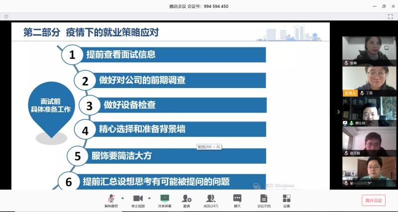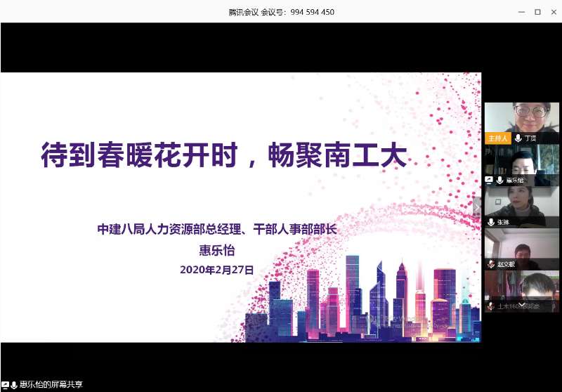为进一步做好疫情防控期间的毕业生就业工作,2月27日下午,tyc1286太阳成集团举办了网络就业指导讲座,中建八局人力资源部总经理、干部人事部部长惠乐怡应邀担任主讲。党委学工部副部长张涛、tyc1286太阳成集团党委副书记丁贤、毕业班辅导员和250余名毕业生参加了讲座,讲座由丁贤主持。