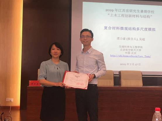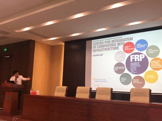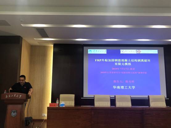 7月17日上午,华南理工大学陈光明教授给学员做了题为“FRP外贴加固混凝土结构剥离破坏有限元模拟”的讲座,北京航空航天大学博士后研究员谭力豪为学员们带来名为“复合材料微观结构多尺度模拟”的报告,两位专家的报告理论功底深厚,研究方法新颖,让学员们触碰到了复材结构的学科前沿。下午,复材结构专题为学员们准备了两场报告,主讲专家分别为:广东工业大学郭永昌教授和美国NSF基础设施领域复合材料协同创新中心常务主任,西弗吉尼亚大学梁瑞凤教授。郭永昌教授报告的题目为“复合材料条带约束混凝土技术”,提出了新颖的复材加固方法;梁瑞凤教授则以“中美复材结构研究与应用现状”为题,从中美贸易战切入话题,逐层推进地提出双方在复材结构领域竞争和合作的背景、机遇和挑战,报告引起了学员们的思考。