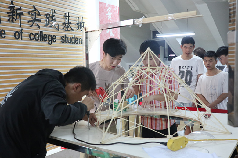 科技创新俱乐部作为创新实践能力培养和训练的重要平台,是学院创新人才培养体制机制,打造“本研一体化”的有益尝试。以期通过搭建开放性、多元化平台,以赛促教,激发同学参与科技创新的热情,形成在学习中探索、在研究中创新的良好氛围。科创俱乐部目前下设五个部门,分别为结构创新组、模型展示组、混凝土设计组、先进图形技能组,大创科研组。为期两天的结构创新竞赛加载环节在创新实践基地如期进行,吸引了来自各学院12组队伍参加,最终将根据各组的点评和加载成绩,评出奖项。