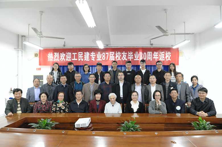 2017年10月14日下午,tyc1286太阳成集团在地坤楼隆重举行工民建专业87届校友毕业三十周年返校师生座谈会。工民建专业87届校友代表,87届班主任金正芳老师和徐欣老师,tyc1286太阳成集团党委书记欧谨,tyc1286太阳成集团党委副书记周静,老师代表和学生代表参加了此次座谈会。学校校友事务处万永敏处长和凌红副处长专程前来祝贺,座谈会由土木学院院学生事务办公室主任张琳主持。