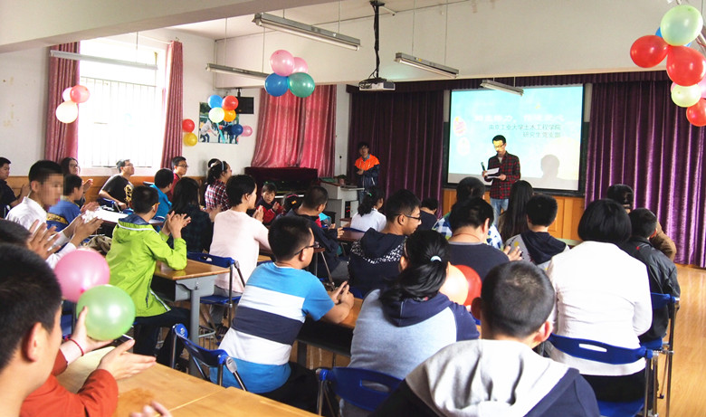 5月13日中午,研究生第十二、十三党支部的全体党员和入党积极分子来到了南京鼓楼区特殊教育学校,此次活动邀请到南京鼓楼区特殊教育学校的副校长马校长和研究生辅导员赵凤佳老师共同参与。活动分成三个部分进行,在第一环节的才艺表演中,金弦、李成林、王彬彬三位大男孩带来了歌曲《青春修炼手册》,让每一个孩子在歌声中感受成长;何茜同学为孩子们带来了钢琴独奏《让我们荡起双桨》,随着美妙音符的响起,孩子们不禁的跟随着轻哼起歌谣来;在享受完钢琴曲后,曹航同学带来了口琴表演,一曲欢快的《童年》,带着大家回到了小时候无忧无虑的童年时光。第二环节是由万欢、耿萌和王迪同学为孩子们讲个小故事《猜猜我有多爱你》,随着她们绘声绘色地表演和讲述,孩子们都渐渐沉浸在故事中。第三环节是孩子们最爱的游戏环节-----抢凳子。最后我们向特殊教育学校捐赠了图书、画本等,期望孩子们能够在书本中找寻到快乐。