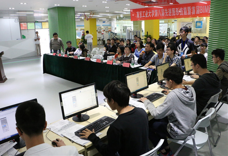 校教学事务部部长钱小明首先致开幕词,有力地鼓舞了参赛选手的士气;裁判长周佶教授宣读比赛规则并宣布比赛正式开始。比赛共有来自土木学院、建筑学院、城建学院、电控学院等35名学生,经前期土木学院统一组织的集训、培训、预选赛选拔入选决赛。赛题由三维建模和二维绘图两项任务组成,要求选手在规定比赛时间完成赛题,提前完成者有加分。比赛将选手分为7组,每组5名成员同场竞技,评委老师根据标注、门窗、施工图布局、效果图等十多项指标进行打分评审。赛场不断切换的大屏幕和裁判长的实时解说向观众们直播了选手们的赛程进展,精彩激烈的场面赢得现场同学的阵阵掌声。