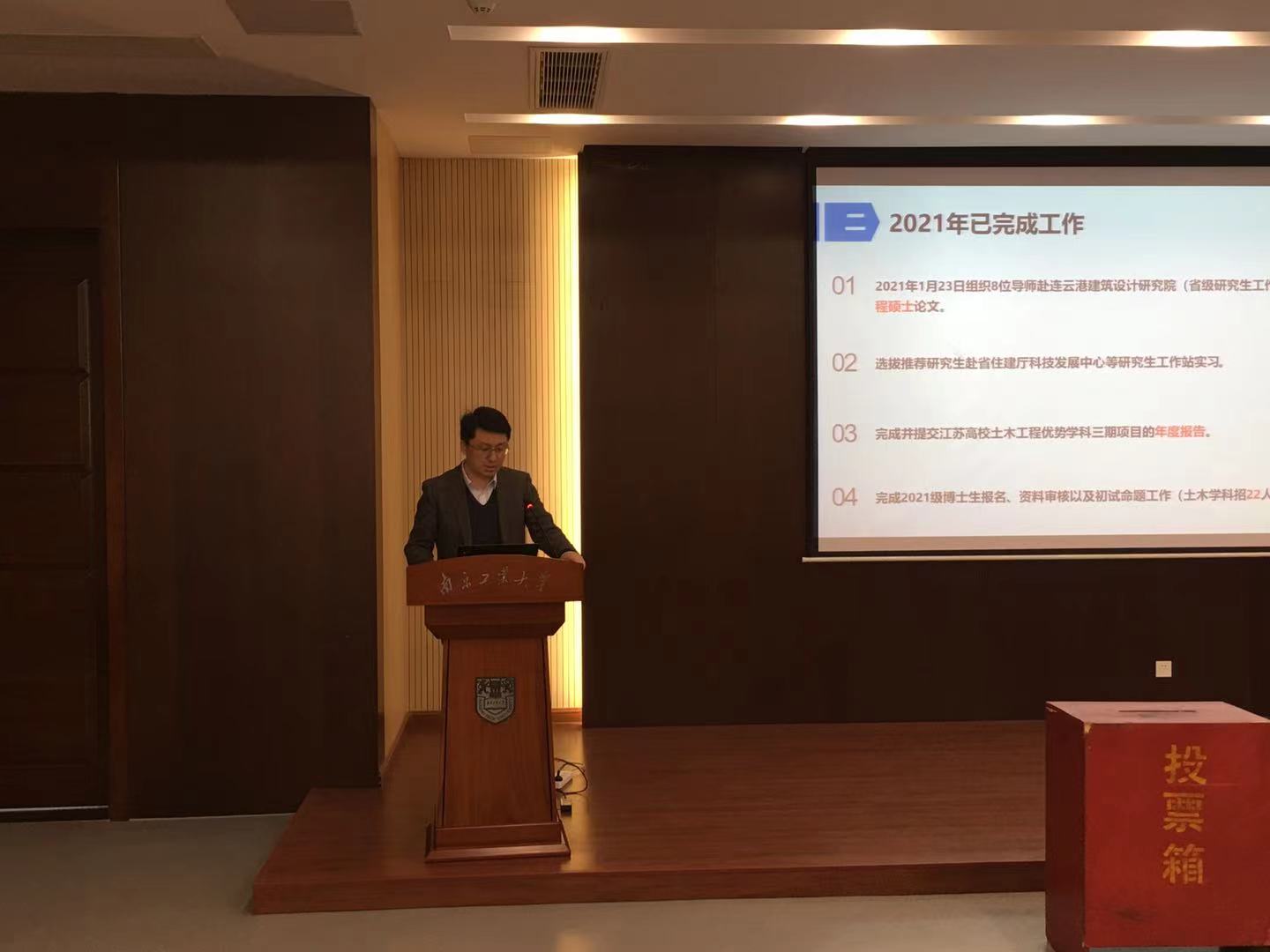 大会伊始,王曙光院长介绍了学院领导班子成员变化情况,传达了学校安全生产工作会议精神,要求全院教职工进一步提高政治站位,进一步压实安全责任,进一步强化隐患源头治理,进一步加大技防投入,进一步加强综合施策,形成人人讲安全、事事为安全、时时想安全、处处要安全的工作氛围。随后,王院长从学科建设、人才引育、科学研究、国际合作等方面部署了2021年的学院工作重点。他指出,要以本为本,建设土木工程国家一流本科专业、国家一流本科课程;要加强高水平人才引育,力争学科评估提档升等;要加强国际化合作,推进产学研协同创新。副院长王俊、方海分别就本科教学、研究生培养等方面工作进行了部署。