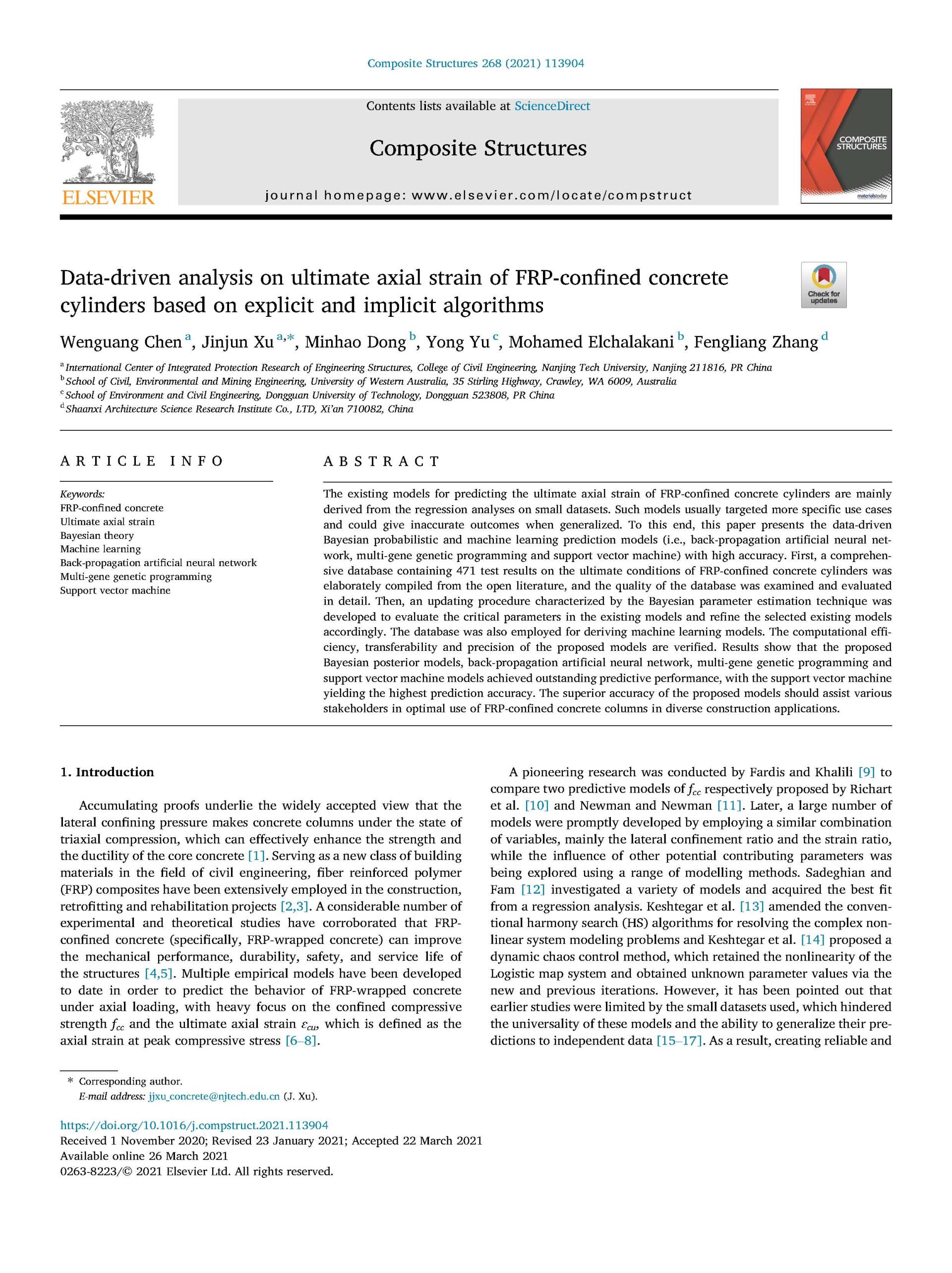 近日,tyc1286太阳成集团徐金俊老师团队收到Elsevier旗下期刊《Composite Structures》的论文刊登通知,正式在线出版题为“Data-driven analysis on ultimate axial strain of FRP-confined concrete cylinders based on explicit and implicit algorithms”的学术论文,其中第一作者为太阳成官网大三学子陈文广同学、通讯作者为徐金俊老师,tyc1286太阳成集团同时为第一单位和通讯单位,论文合作者为University of Western Australia的Mohamed Elchalakani教授团队。值得注意的是,《Composite Structures》属于土木工程领域高水平学术期刊,其上发表的论文被美国科学引文索引(Science Citation Index,简称SCI),隶属中科院大区二区、JCR Q1级别,在行业内具有很高的影响力。这是tyc1286太阳成集团本科生为第一作者身份首次在该级别期刊上发表论文,在全院学生中起到良好的激励和示范作用。
