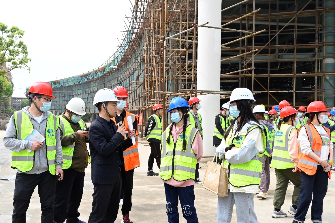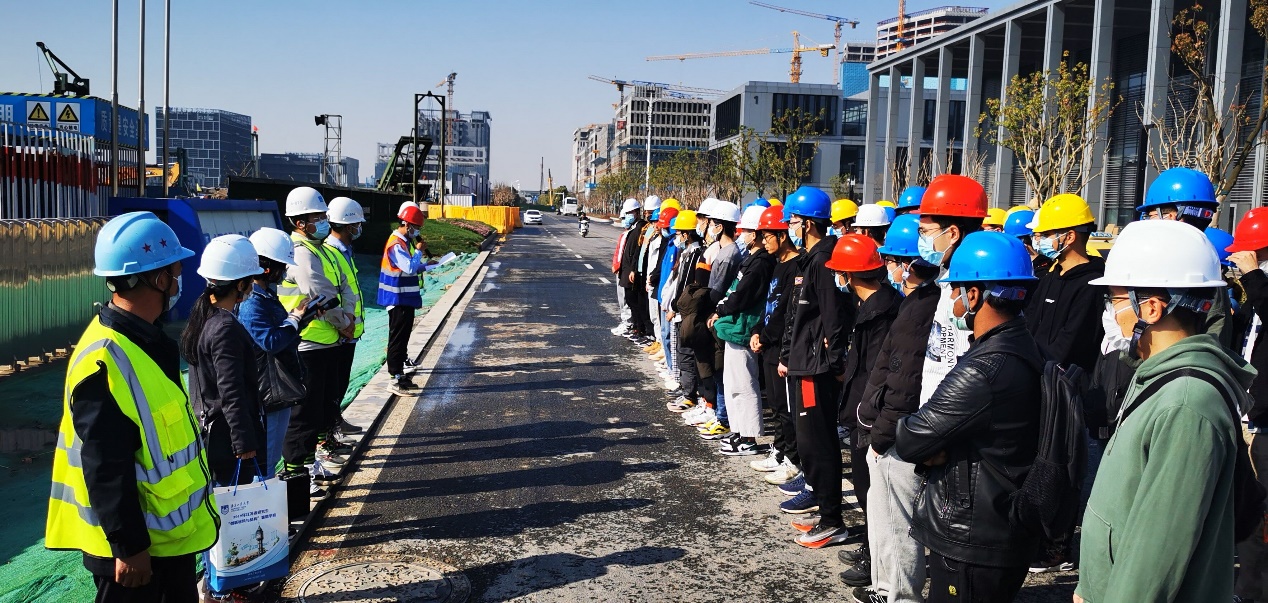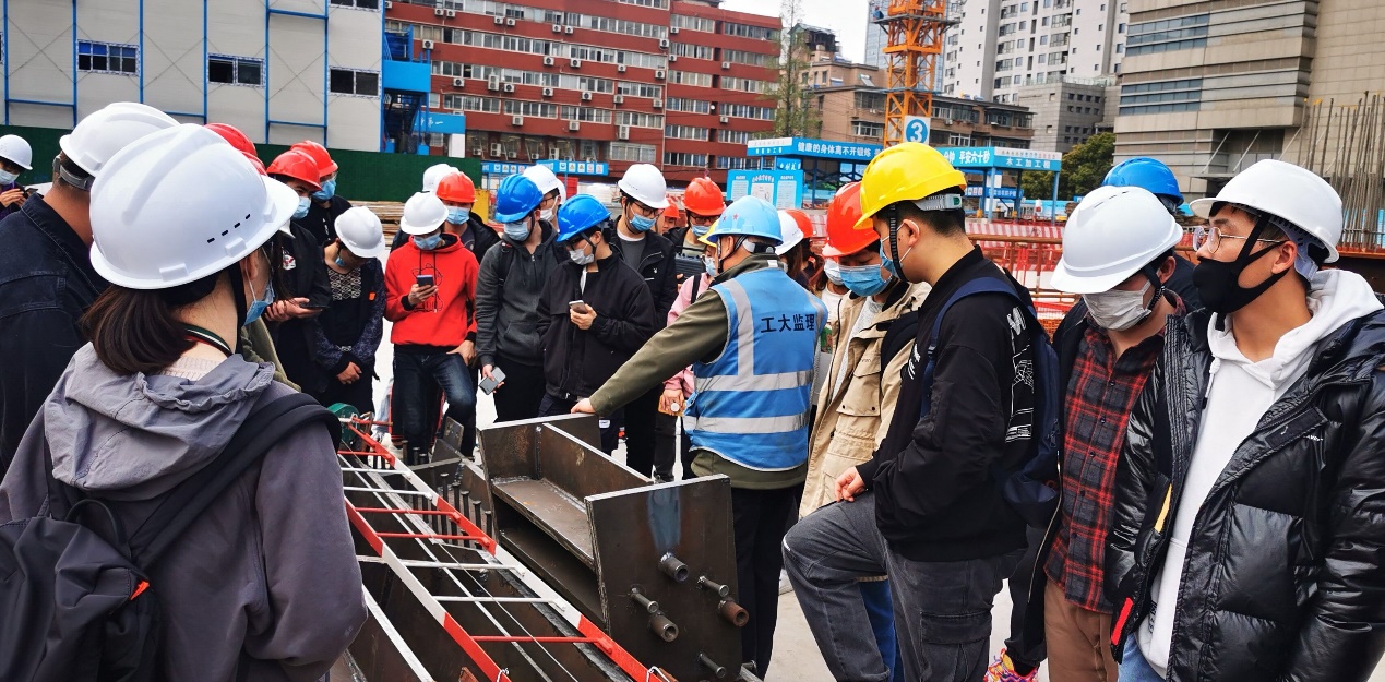 3月23日,在卢红琴、宋俊美、霍瑞丽、方园等老师的带领下,同学们参观了南京金茂广场二期项目工程,该项目位于南京市鼓楼区,由华东建筑设计研究院有限公司设计、南京工大建设监理咨询有限公司监理、中建三局第一建设工程有限责任公司建设,是集商业、写字楼、住宅、酒店和SOHO办公功能于一体的地标性建筑,总建筑面积270784.74平方米,主楼67层,地下5层,建筑立面总高度308米,主塔楼采用钢骨混凝土框架-混凝土核心筒结构体系。项目基坑面积基本占据整个场地的面积,采用全逆作法施工,周边建筑距离较近,施工工序复杂,难度较大。同学们通过现场聆听专业技术人员的讲解和观看施工工艺动画,对超高层建筑的设计方法、施工工序等有了一定的认识。