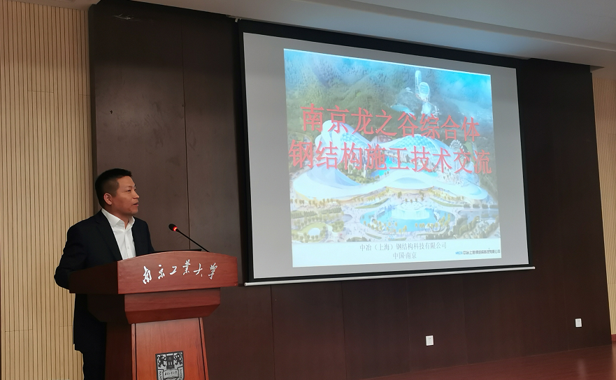 4月16日上午,在中冶(上海)钢结构科技有限公司刘明路副总工程师等领导的指导、关心和帮助下,同学们参观了南京东方龙之谷钢结构工程项目,该项目位于南京市江北新区沿山大道,总建筑面积约60万平方米,由五个场馆和龙藏山谷-溶洞等六部分组成,是全亚洲最大的综合性室内体验园。场馆采用大跨度钢桁架体系,通过现场施工负责人任光辉、陈杰的讲解,同学们对钢桁架体系的构造和施工关键技术有了更深刻的认识。