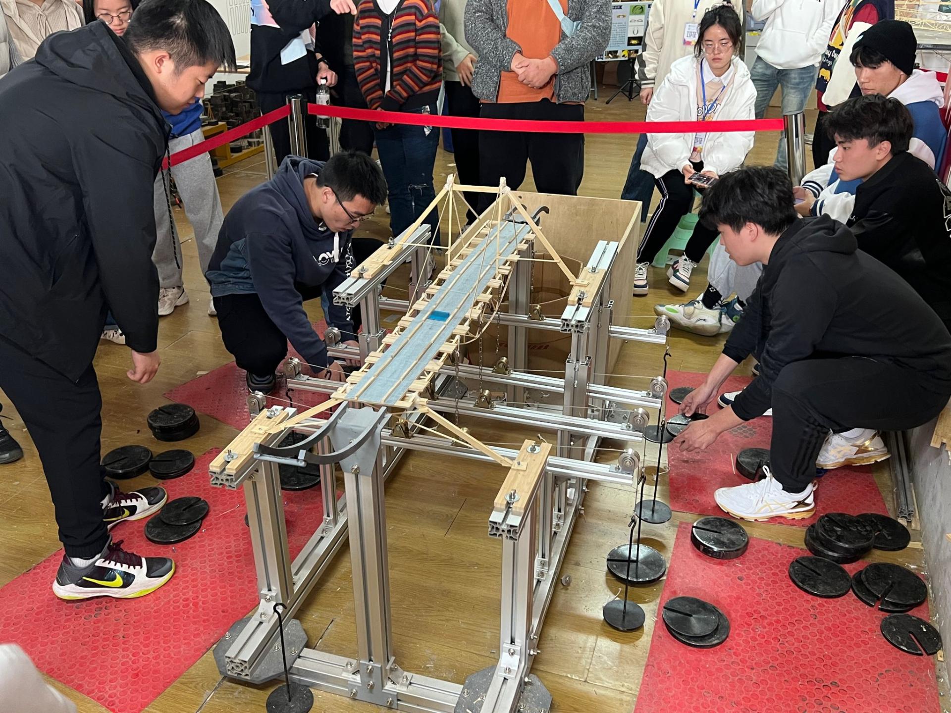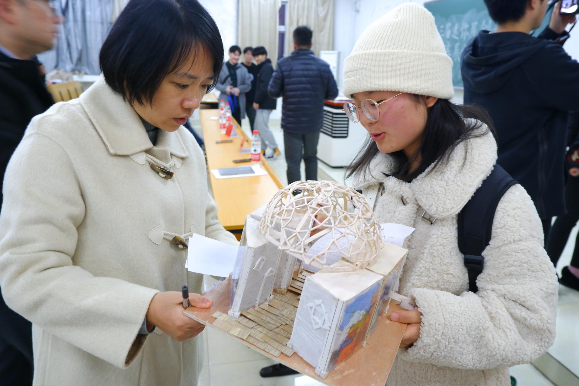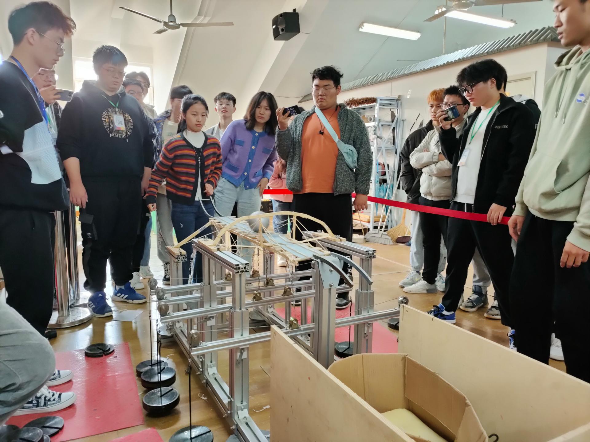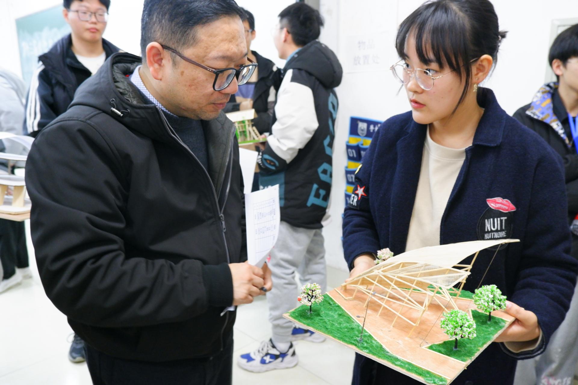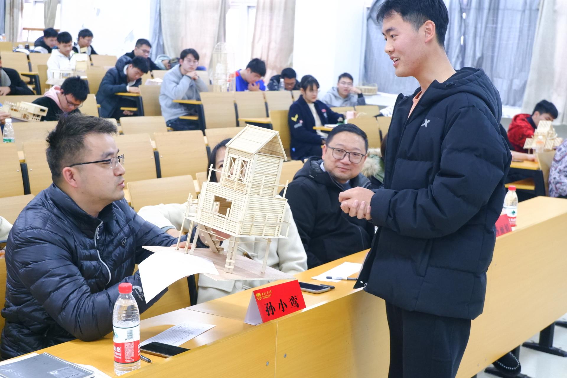 在加载组决赛中,44组参赛选手在2个星期时间里把理论付诸实践,令想象化为现实,经过8小时紧张激烈的加载,他们以卓越的思维力和默契的团队合作能力创造了一个个精妙绝伦的“微缩桥梁”,真正实现了“学以致用,最终17组团队脱颖而出,其中陈星宏和周涌昊同学负责的两组以轻便的重量和独特的结构从众多佼佼者中脱颖而出获得一等奖。本次赛题设计除对桥梁尺寸与材料作要求外,不做其他限制,以求充分激发选手的创新活力。斜拉结构的灵活运用,鱼腹梁结构的巧妙结合,锥形桥体的大胆创新,无不体现选手的匠心精神。在模型展示组决赛现场,39个参赛作品各有千秋,从具备古典美的木屋,到具有现代感的体育场;从充满人文气息的竞技场,到充斥着幽静感的林间屋舍——竹条交错搭建出的不只是作品,还是参赛队员们汗水与心血的凝练。最终,王苏豫小组以他们构思精妙,大胆创新的作品赢得老师们的一致认可,脱颖而出,获得展示组一等奖的成绩。评委老师对参赛作品进行了专业点评,鼓励学生持续改进,不断取得进步。