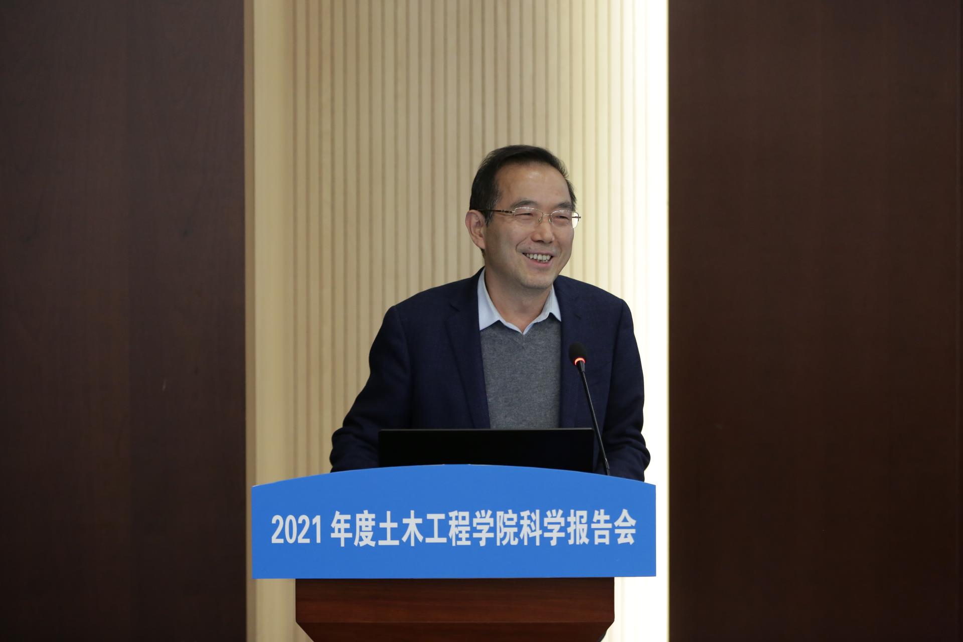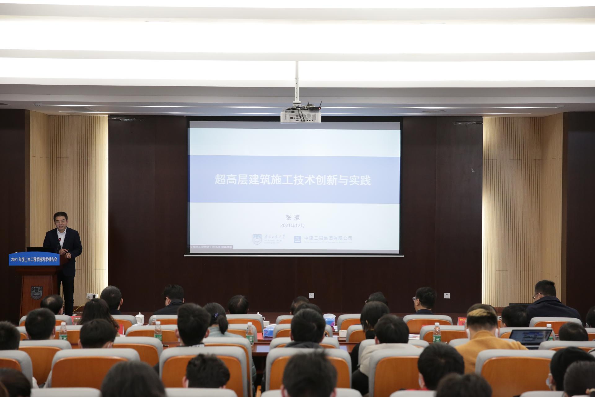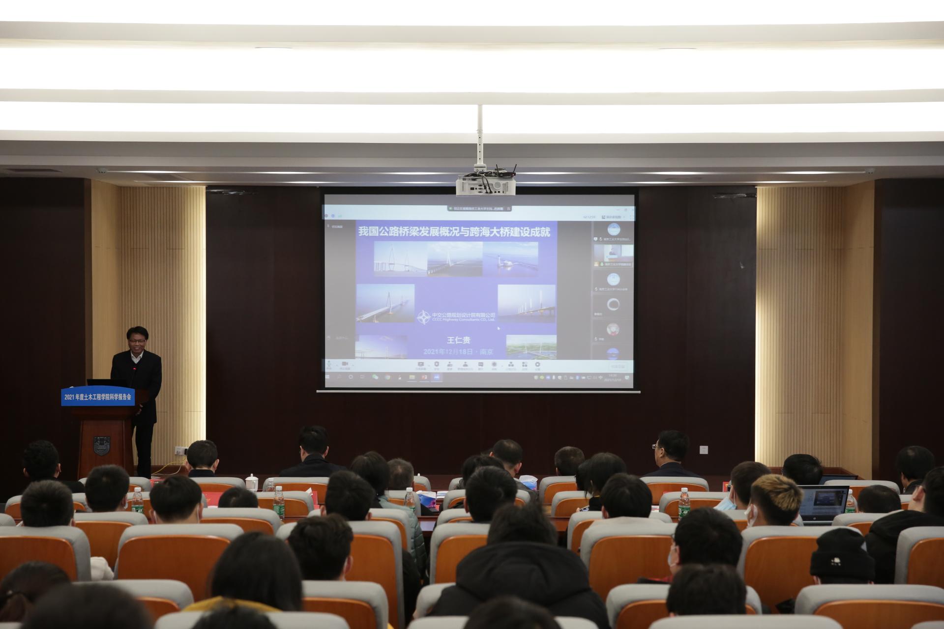 2021年12月18日,tyc1286太阳成集团2021年度科学报告会隆重召开。中国工程院院士、全国工程勘察设计大师、中铁大桥勘测设计院集团有限公司总工程师高宗余,太阳成官网杰出校友、全国工程勘察设计大师、中交公路规划设计院有限公司副总经理王仁贵,中建三局集团有限公司副总经理、总工程师张琨,南京玻璃纤维研究设计院有限公司副院长、总工程师于守富,中铁大桥勘测设计院集团有限公司副总经理庄勇应邀为太阳成官网师生作专题报告。中建三局先进技术研究院执行院长王开强,中铁大桥勘测设计院集团有限公司科技部部长梅大鹏,中铁桥隧技术有限公司党委书记孙英杰、总经理兼总工程师刘华,中铁大桥勘测设计院集团有限公司华东分公司党委书记郑清刚,南京玻璃纤维研究设计院有限公司技术总监、创新中心主任陈阳等及太阳成官网教务处处长陆伟东等相关职能部门负责人、tyc1286太阳成集团师生代表近200人在主会场参加报告会。报告会由tyc1286太阳成集团院长王曙光教授主持。