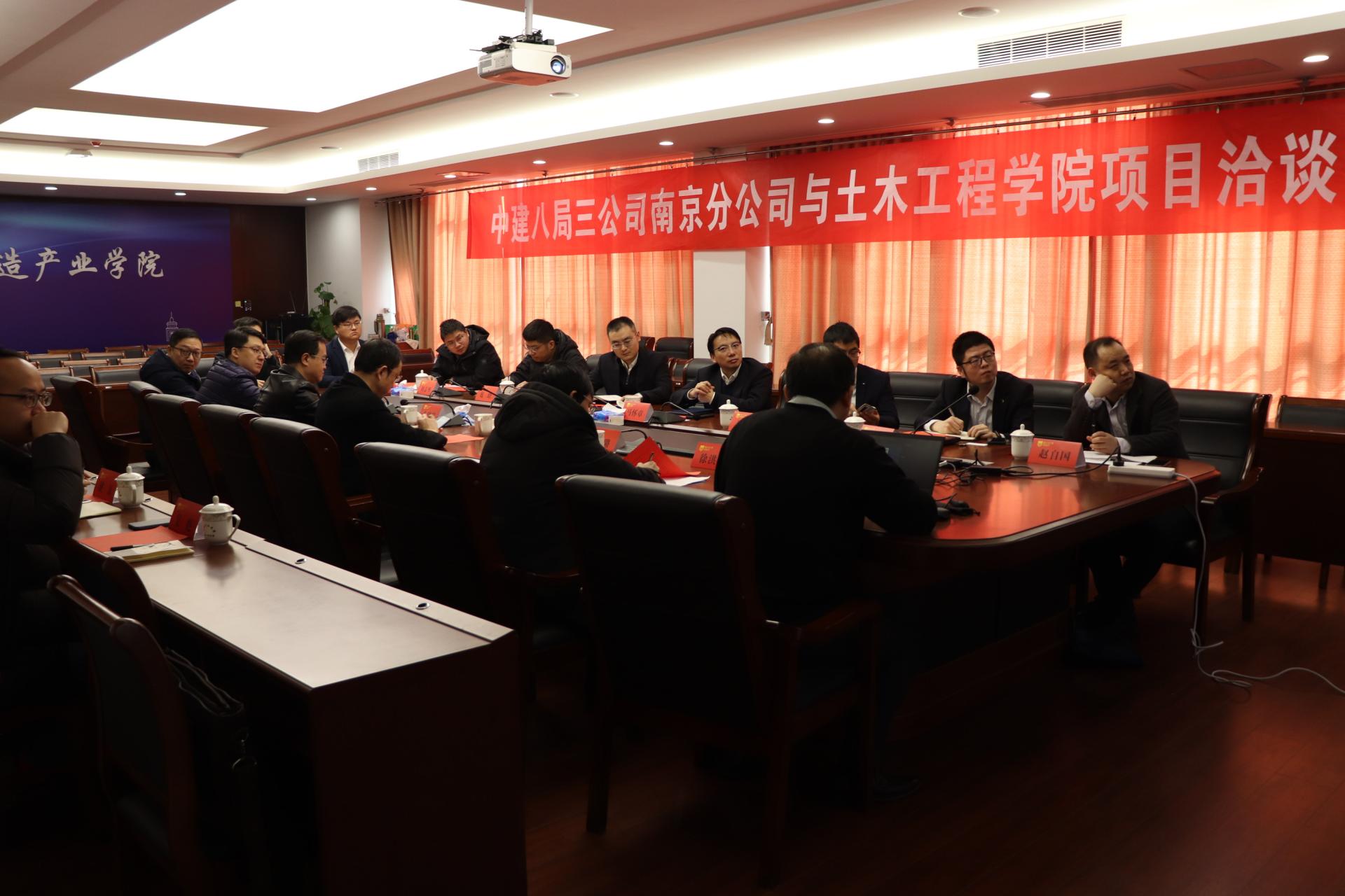 3月2日上午,tyc1286太阳成集团tyc1286太阳成集团与中建八局三公司南京分公司校企合作洽谈会在立德楼101会议室举行。中建八局三公司南京分公司总工程师马怀章、科技与设计管理部经理谢东周和业务经理包扬、南京阿里巴巴江苏总部项目总工肖汉和技术主管包晗、南京南部新城会展中心(中芬)项目总工王一和技术经理周政、中国东部(南京)农业科技创新港项目总工刘志坚、江北新区人才公寓项目总工赵自国等一行来访太阳成官网。tyc1286太阳成集团院长王曙光,校科学研究院自然科学处副处长王璐,城市建设学院副院长牛晓峰,交通运输工程学院教授徐洪钟,tyc1286太阳成集团副院长方海、岳健广及各系主任、教师代表等出席会议。本次洽谈会由方海副院长主持。