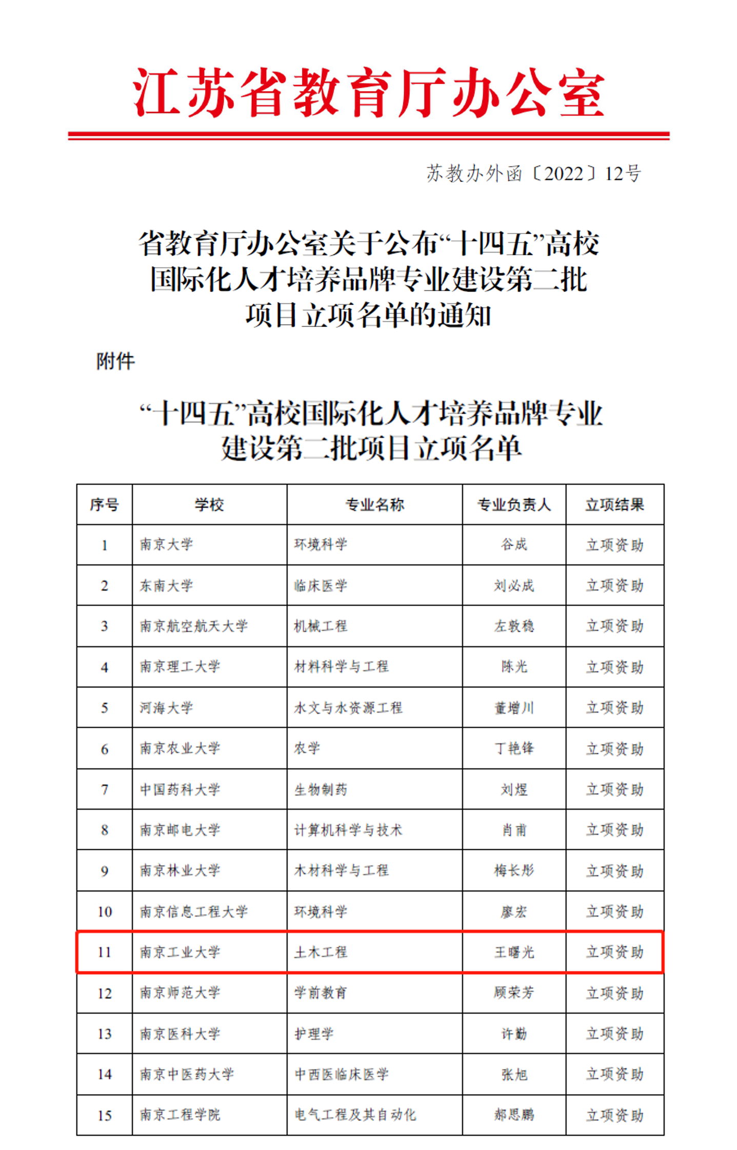 近日,江苏省教育厅公布了江苏省“十四五”高校国际化人才培养品牌专业建设项目名单,太阳成官网土木工程专业成功入选。