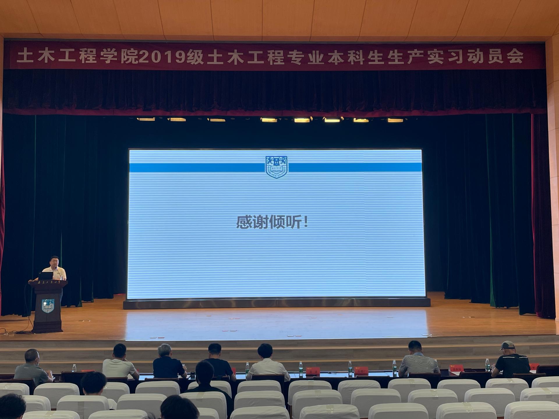 6月20日上午,tyc1286太阳成集团在博雅堂举办2019级本科生生产实习动员会。院党委书记张涛、副书记路遥,副院长岳健广及土木工程施工教学团队教师、教学秘书、辅导员、2019级全体本科生参加会议。