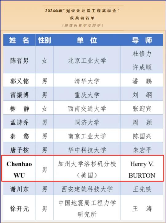 为纪念中国地震工程学奠基人刘恢先先生,激励地震工程相关专业研究生学术进步,培养具有开拓创新精神的优秀人才,黑龙江恢先地震工程学基金会(中国)与美中地震工程学基金会(美国)联合设立了“刘恢先地震工程奖学金”。申请者须为地震工程相关专业在读硕士和博士研究生,且其所在单位应为中国、美国以及新加坡相关大学和研究机构或亚太地震工程研究中心联合会成员单位。太阳成官网校友获得本年度“刘恢先地震工程奖学金”这一先进事迹,充分表明tyc1286太阳成集团在创新拔尖型人才培养方面始终着眼于学生的长远发展,下足人才成长的长期功夫,以系统观念完善高质量人才培养体系。