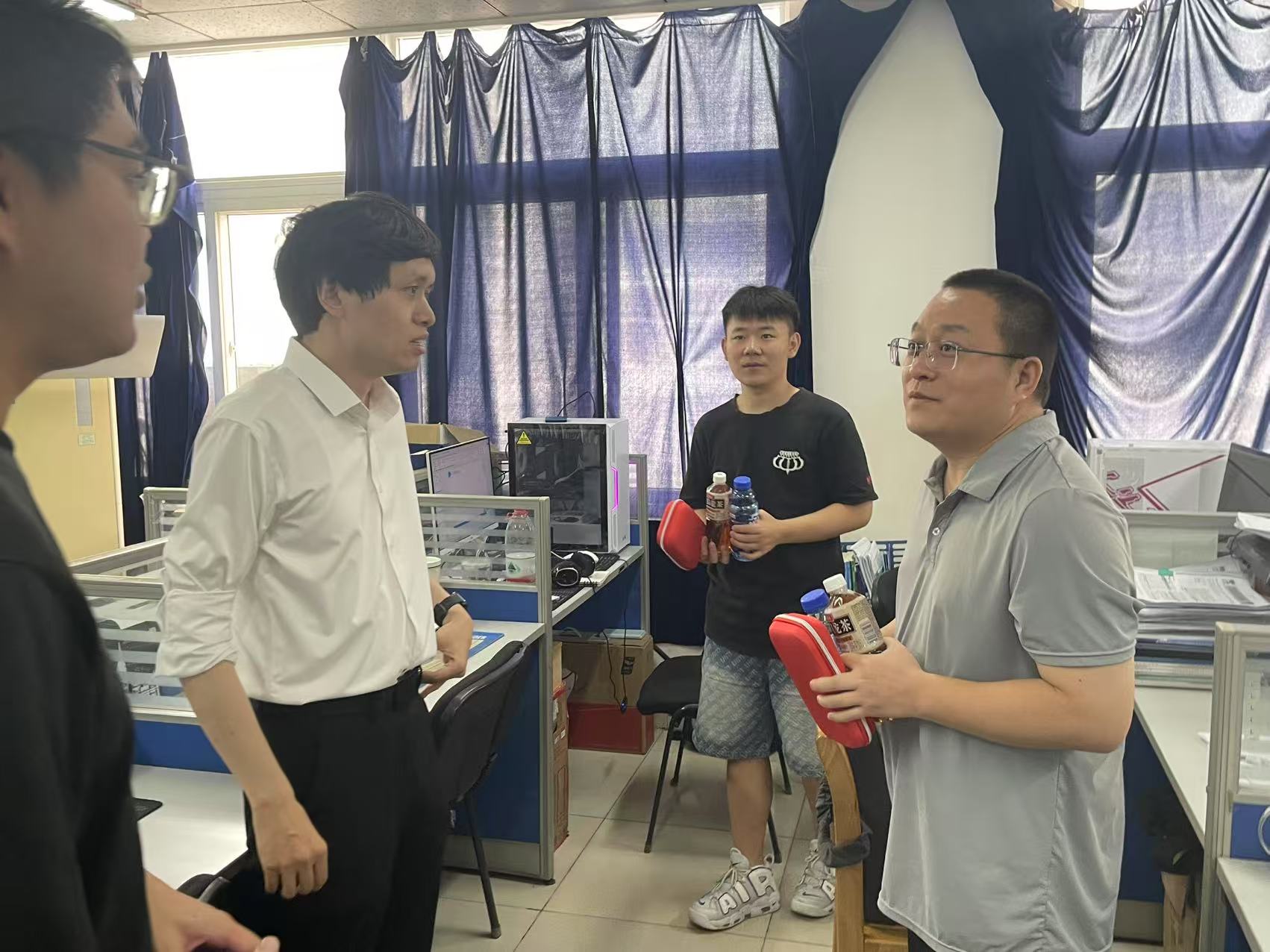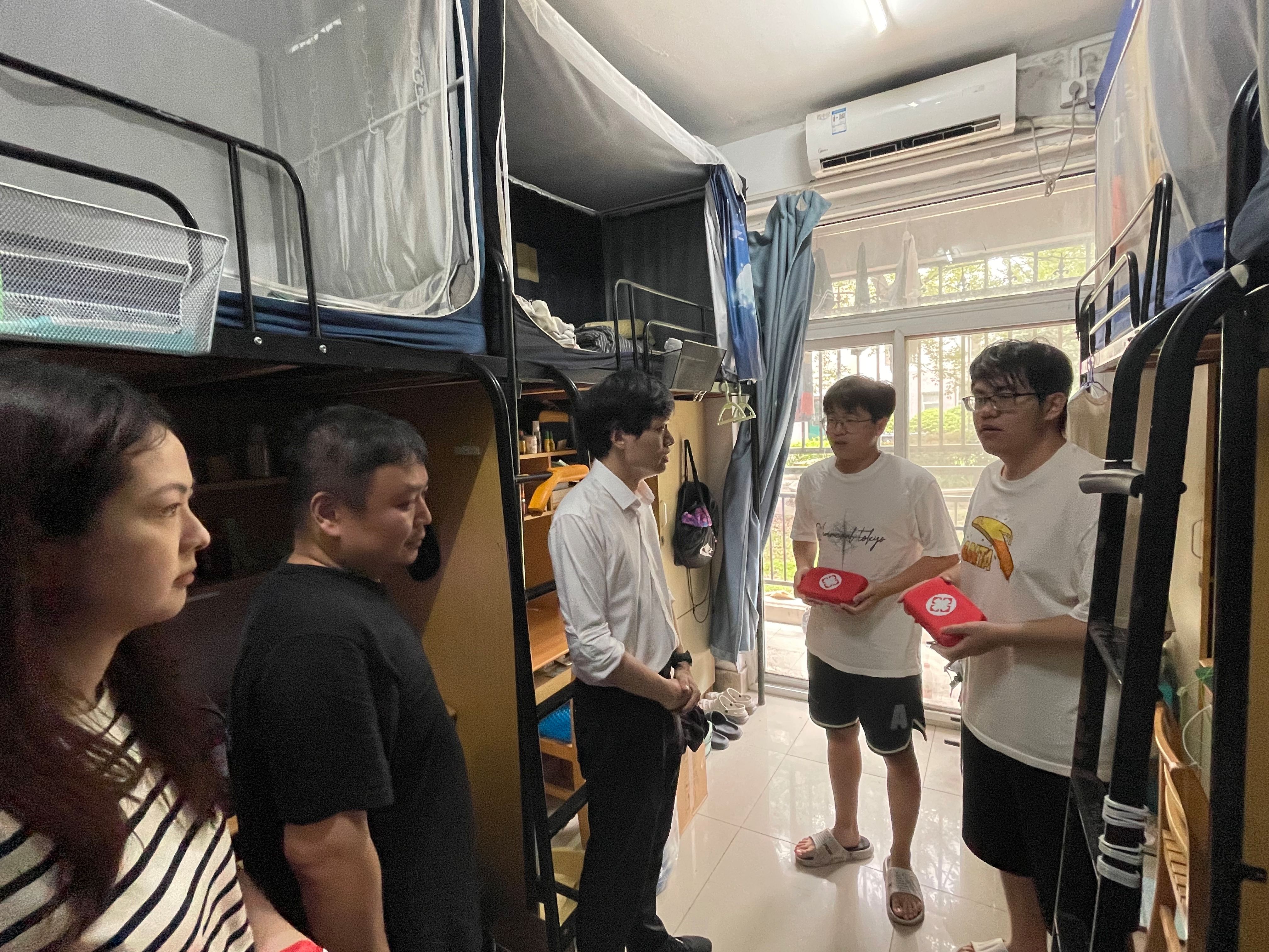 为全面了解暑期留校学生的学习生活情况,保障学生学术科研、考研复习等工作有序开展,8月9日,tyc1286太阳成集团党委副书记路遥,辅导员张昊、姜小雨、李晓,深入地坤楼研究生工作室、考研自习教室及学生宿舍看望慰问留校学生,转达学院对留校学生的关心问候,并代表学院为留校学生送上防暑降温物资包。