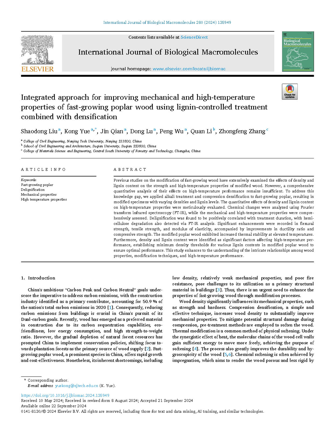 论文I题为“Integrated approach for improving mechanical and high-temperature properties of fast-growing poplar wood using lignin-controlled treatment combined with densification”,发表于《International Journal of Biological Macromolecules》(中科院大类学科“化学”1区,小类学科“高分子科学”1区,TOP期刊,IF=7.7)。2023级硕士研究生刘少东为第一作者,岳孔教授为通讯作者,其他作者分别为2022级硕士研究生钱锦、2020级硕士研究生陆栋、吴鹏副教授,以及合作单位的李权教授和张仲凤教授。