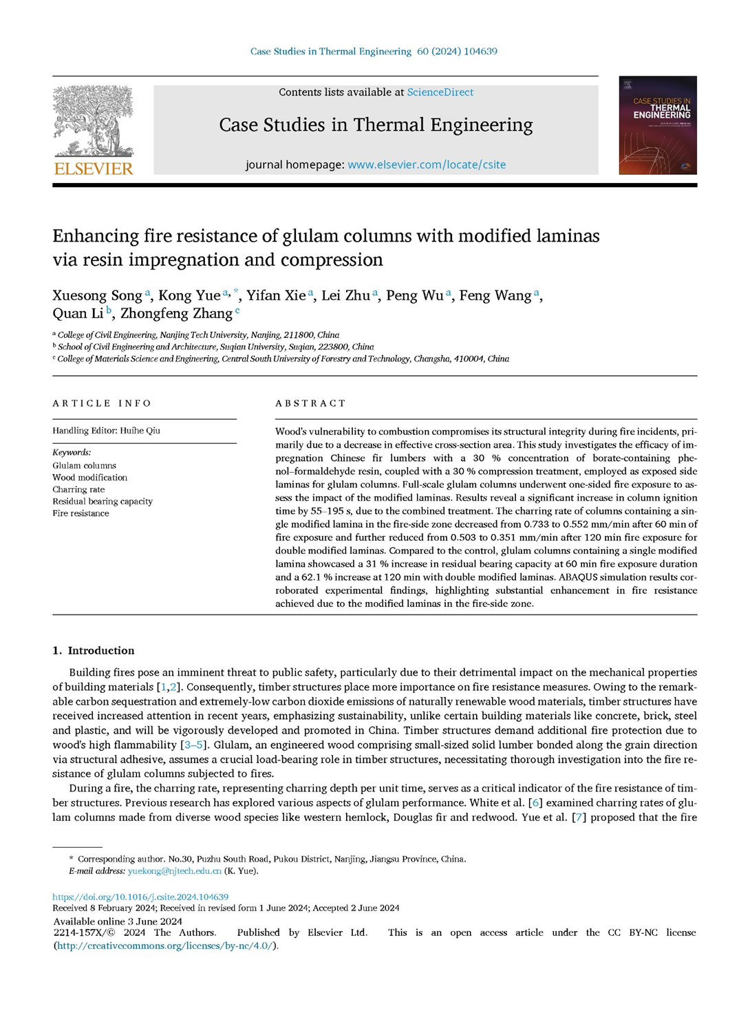 论文V题为“Enhancing fire resistance of glulam columns with modified laminas via resin impregnation and compression”,发表于《Case Studies in Thermal Engineering》(中科院大类学科“工程技术”2区,小类学科“热力学”2区,TOP期刊,IF=6.8),2021级硕士研究生宋学松为第一作者,岳孔教授为通讯作者,其他作者分别为本科生谢一帆、2023级硕士研究生朱磊、吴鹏副教授,以及合作单位的李权教授和张仲凤教授。