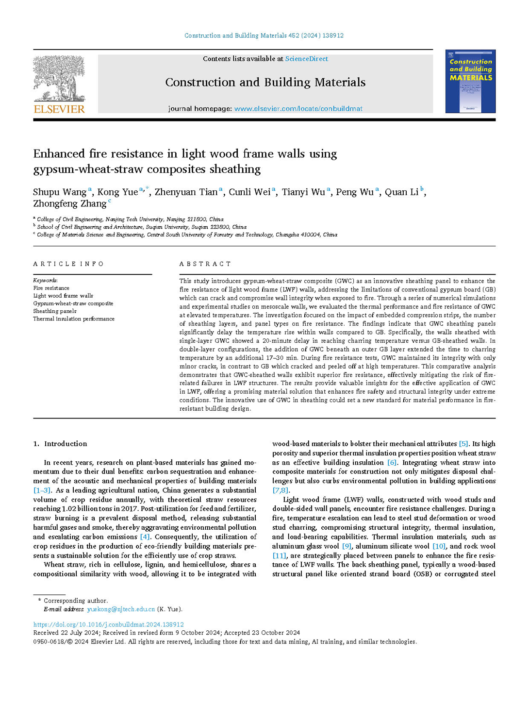 论文II题为“Enhanced fire resistance in light wood frame walls using gypsum-wheat-straw composites sheathing” ,发表于《Construction and Building Materials》(中科院大类学科“工程技术”1区,小类学科“工程:土木”1区,TOP期刊,IF=7.4),2022级硕士研究生王书谱为第一作者,岳孔教授为通讯作者,其他作者分别为2023级硕士研究生田镇源、2024级硕士研究生魏存利、2021级硕士研究生吴添一、吴鹏副教授,以及合作单位的李权教授和张仲凤教授。
