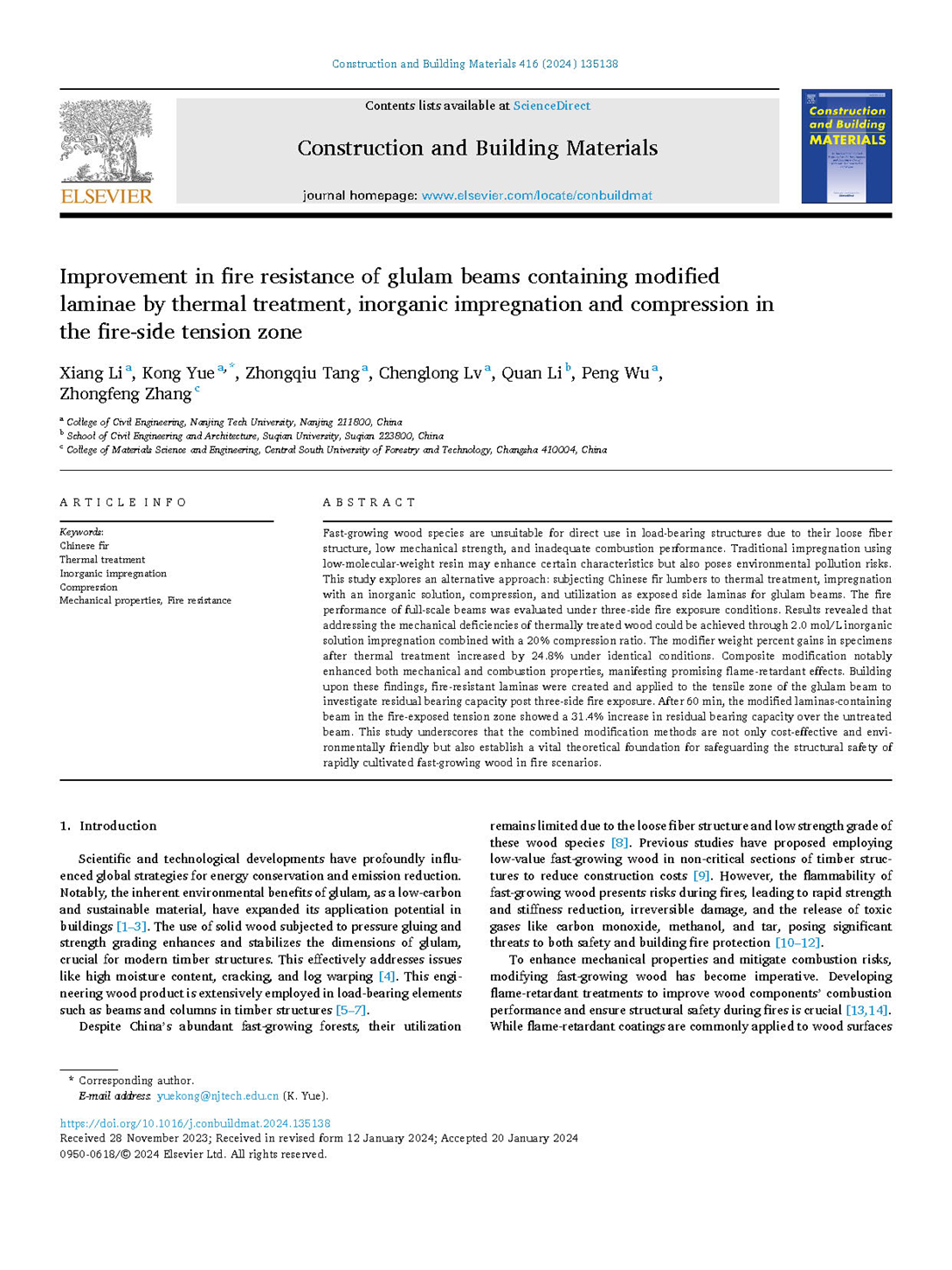 论文IV题为“Improvement in fire resistance of glulam beams containing modified laminae by thermal treatment, inorganic impregnation and compression in the fire-side tension zone”,发表于《Construction and Building Materials》(中科院大类学科“工程技术”1区,小类学科“工程:土木”1区,TOP期刊,IF=7.4),2022级硕士研究生李响为论文的第一作者,岳孔教授为通讯作者,其他作者分别为2019级硕士研究生唐中秋、2020级博士研究生吕城龙、吴鹏副教授,以及合作单位的李权教授和张仲凤教授。