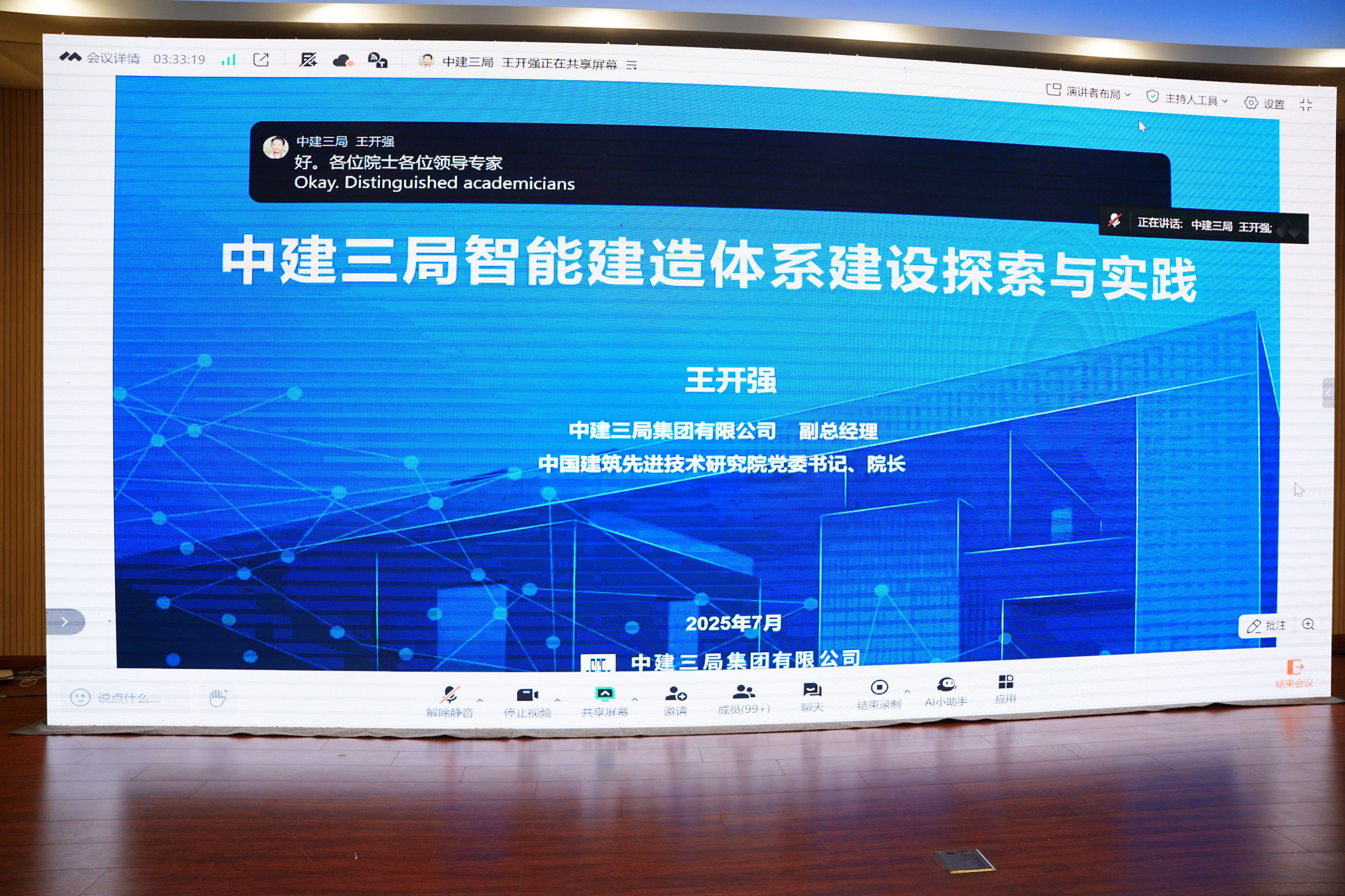 王开强副总经理带来一场题为《智能建造体系建设探索与实践》的学术报告,报告围绕智能建造的发展趋势、技术应用及实践案例展开,深入探讨了BIM技术、物联网、人工智能等在建筑行业的融合创新,分享了智能建造体系在提升工程效率、降低成本及推动行业转型中的重要作用。与会人员纷纷表示,报告内容前瞻性强,为行业智能化升级提供了宝贵思路。